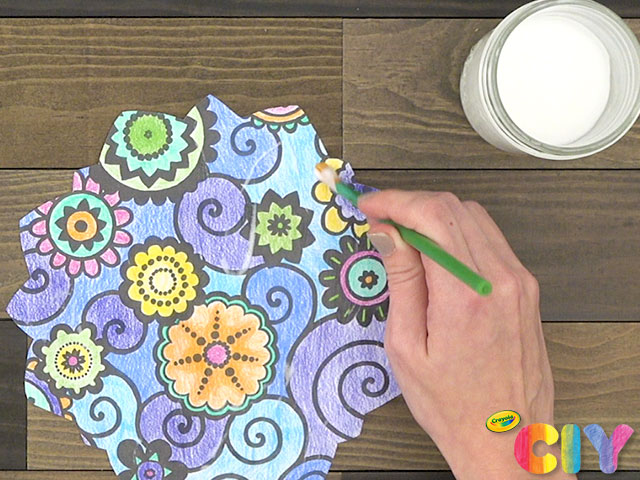 Add a coat of glue mixture to the back of the coloring page. Dry 1–2 hours.