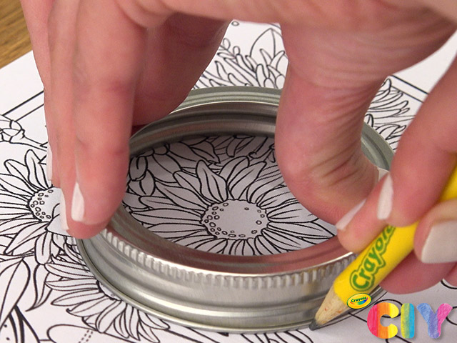 Using colored pencils, color coloring page within traced circle. Cut out circle.