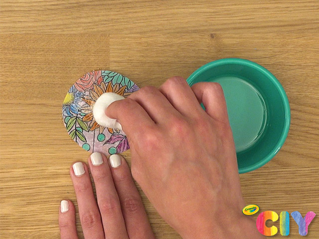 Pour small amount of oil into a bowl. Lightly dip cotton ball into oil and dab onto coloring page. Dry 5 minutes.