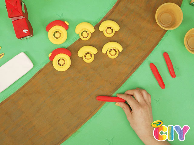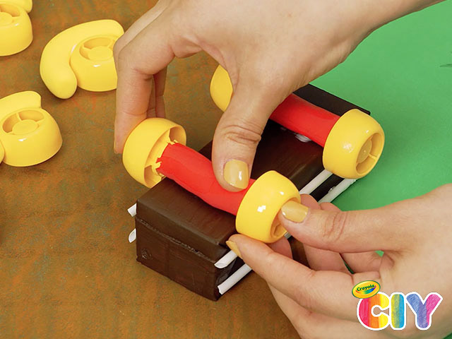 Roll yellow Crayola Model Magic into a thick cylinder and cut into two equal pieces.