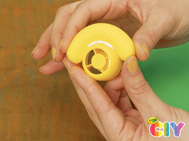 Wrap and glue a cylinder halfway around a Mott’s applesauce pouch cap and let dry (repeat for the second cap).