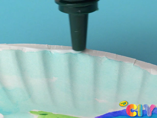 Add sparkly accents to paper plate and snow globe base with glitter glue. Dry 3–4 hours.