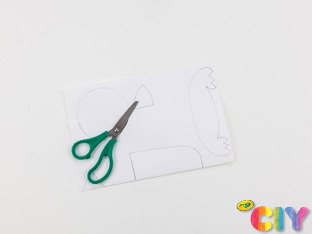 Fold a piece of white paper in half. Trace a large circle, a triangle for the ears and draw a name plate with feet. One the fold line, draw the beak and body. Cut out all the pieces with Crayola® Scissors.
