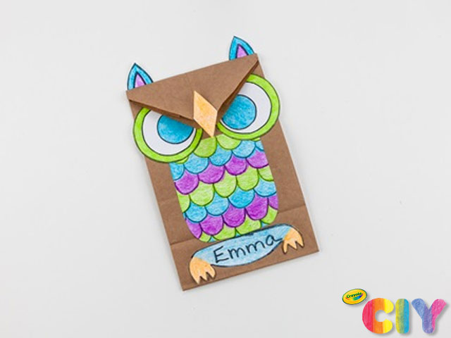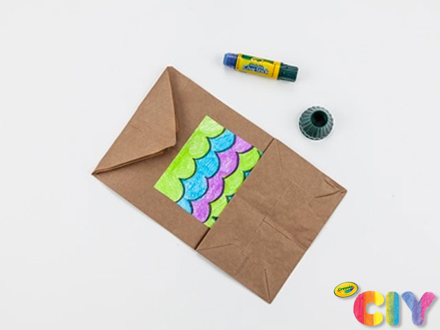 Glue the eyes, body, feet, ears and beak onto the bag with a Crayola Glue Stick.