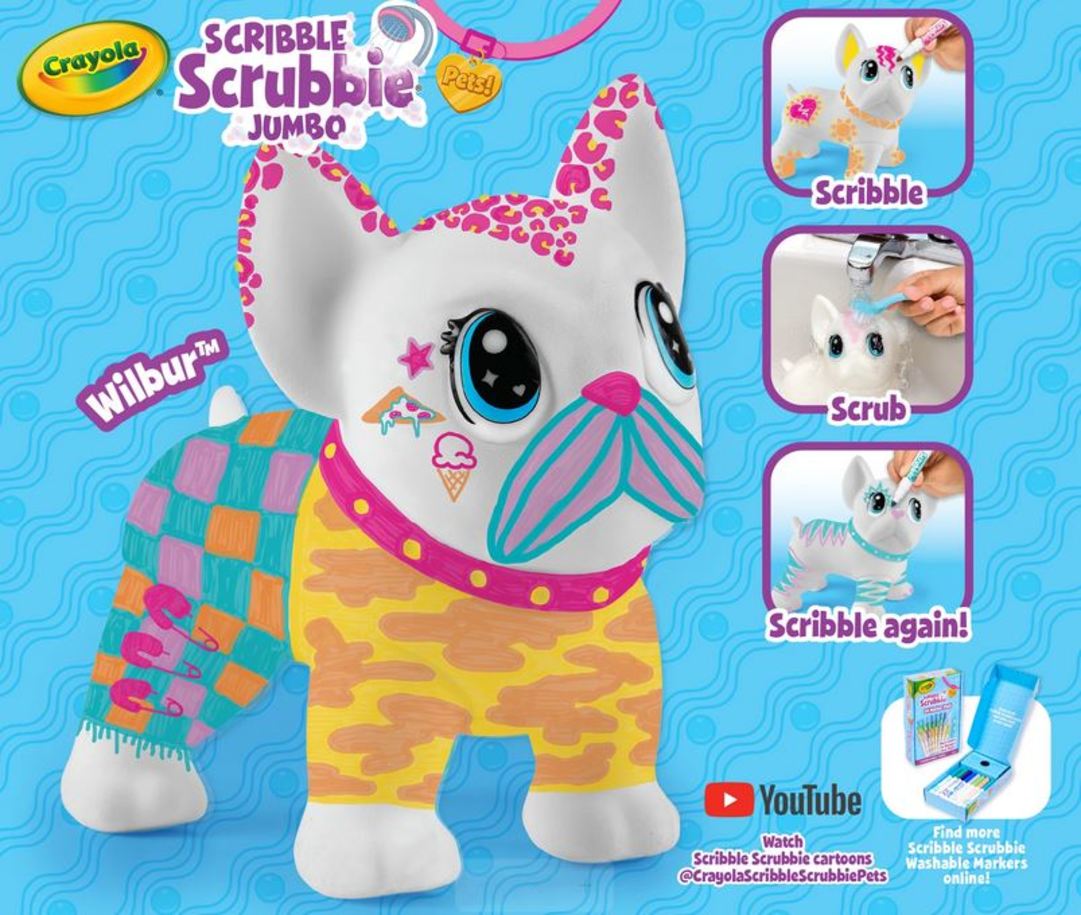 • Scribble Scrubbie is now available in a Jumbo size! Wilbur, the adorable Jumbo pet dog allows kids to have even more space to design and create! With a generous size of over 17cm in height, with a moveable head and legs, Wilbur is more interactive than ever! Kids can create, color and can clean their Jumbo pet and then create color and clean again! Includes 5 washable markers to create vivid, colorful designs. For ages 3+