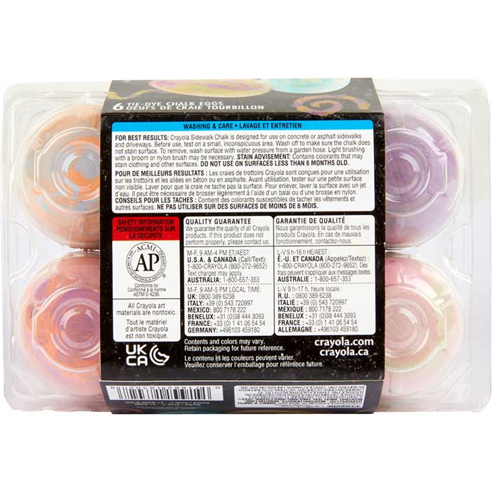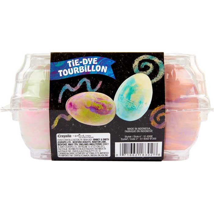 • CRAYOLA TIE-DYE CHALK EGGS: Features 6 Tie-Dye Chalk Eggs, with 2 unique colors per egg, that create unique and funky color patterns with each use!