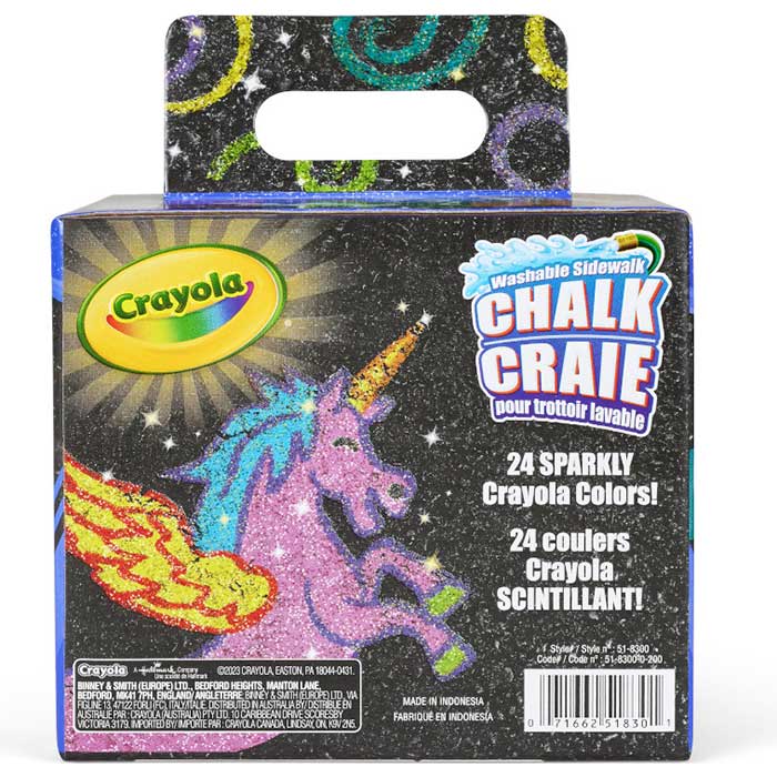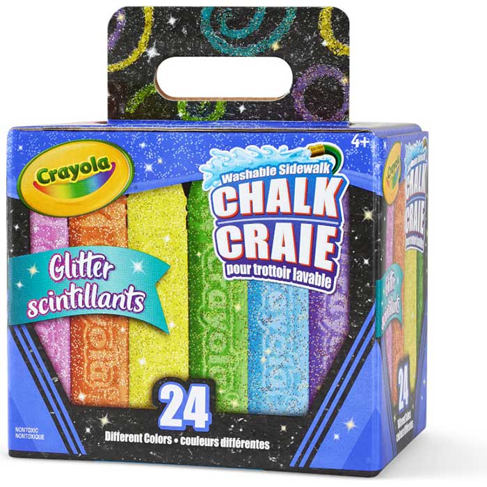 • Get set for a sparkle-filled outdoor play adventure with the Crayola Glitter Chalk Collection! This collection comprises 24 Glitter Chalk sticks in a range of vivid colors, each infused with a unique glitter effect. The assortment of 12 Gold and 12 Silver chalk sticks can turn your ordinary driveway or sidewalk into a radiant canvas. Kids can express their artistic side while getting some fresh air and sunshine outside. And don't worry about the mess, as this washable sidewalk chalk easily washes off driveways, sidewalks, and pavement. Plus, Crayola Chalk is safe and non-toxic, making it the perfect holiday or birthday gift for kids who love to create. Create an eye-popping outdoor landscape with Crayola Glitter Washable Sidewalk Chalk!